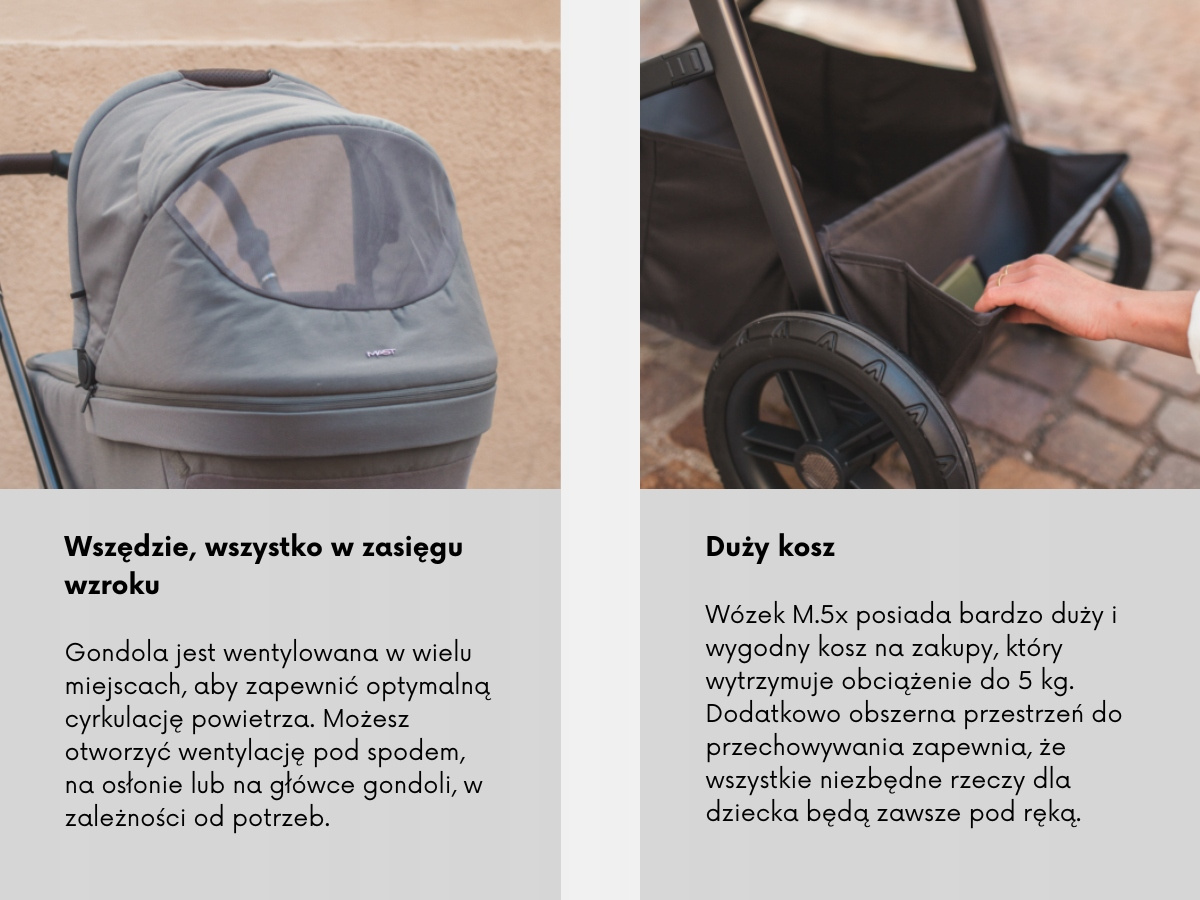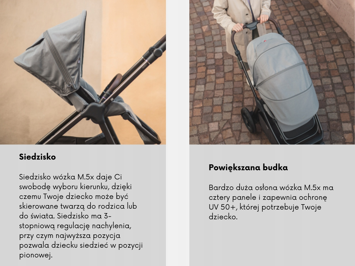Dobre rzeczy wymagają czasu... Wózek M.5x to nowy członek naszej rodziny, który spełnia wszystkie Twoje oczekiwania. W zestawie znajdziesz gondolę, odwracane siedzisko oraz przestronny pokrowiec przeciwdeszczowy, który chroni zarówno siedzisko, jak i gondolę, a także koszyk na zakupy. Wózek M.5x można złożyć na płasko razem z siedziskiem ustawionym w dowolnym kierunku, a po złożeniu pozostaje w pozycji stojącej.